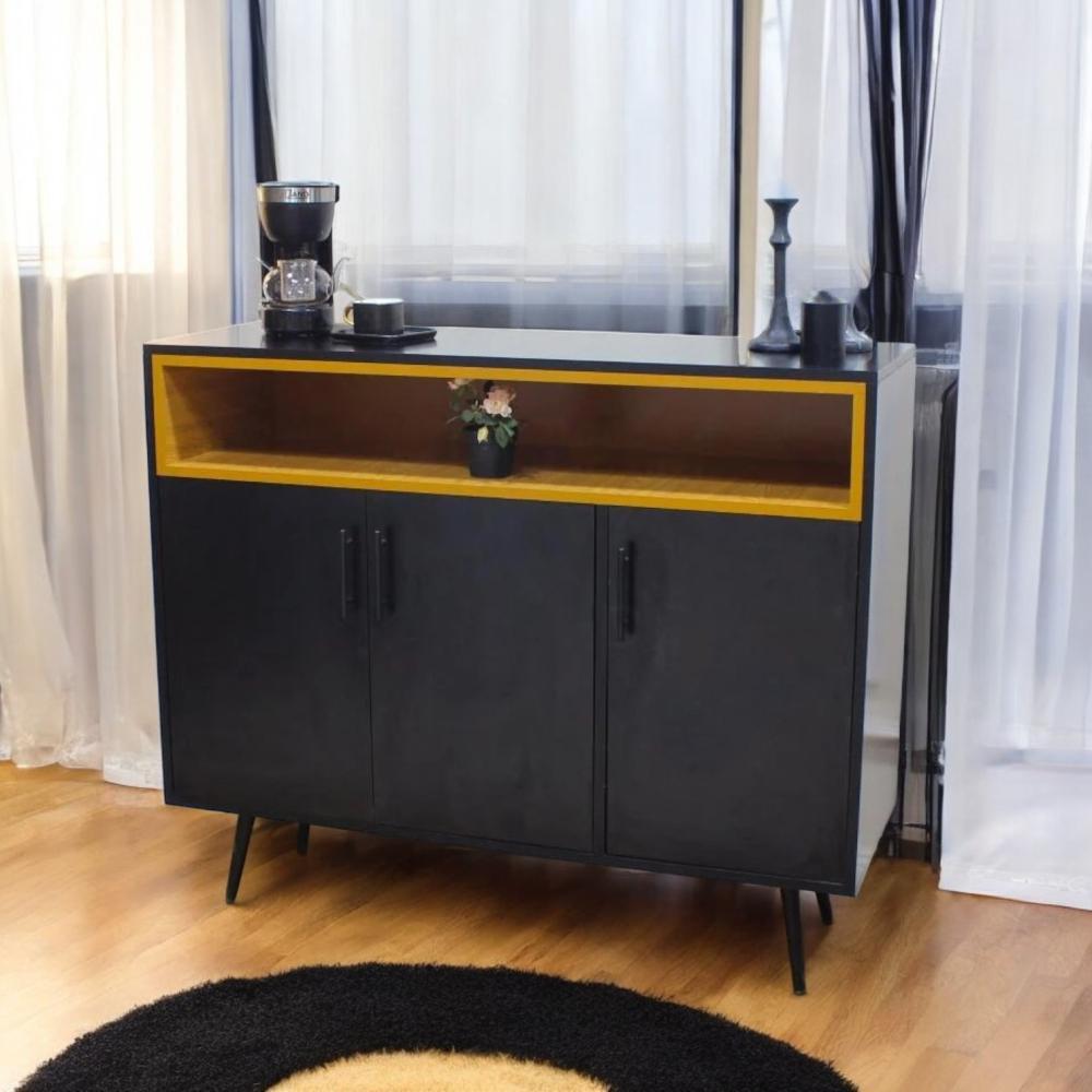 يتميز هذا البوفيه الفريد من نوعه بتصميمه المدهش الذي يجمع بين اللون الأسود الأنيق ولمسات داخلية ذهبية تضفي جاذبية فاخرة. خيار مثالي للمساحات العصرية التي تبحث عن تنظيم مع ذوق رفيع.