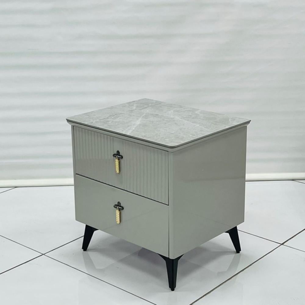 مقابض ذهبية أنيقة: تتميز مقابض الأدراج باللون الذهبي اللامع، مما يضيف لمسة من الفخامة والأناقة للكومودينو.